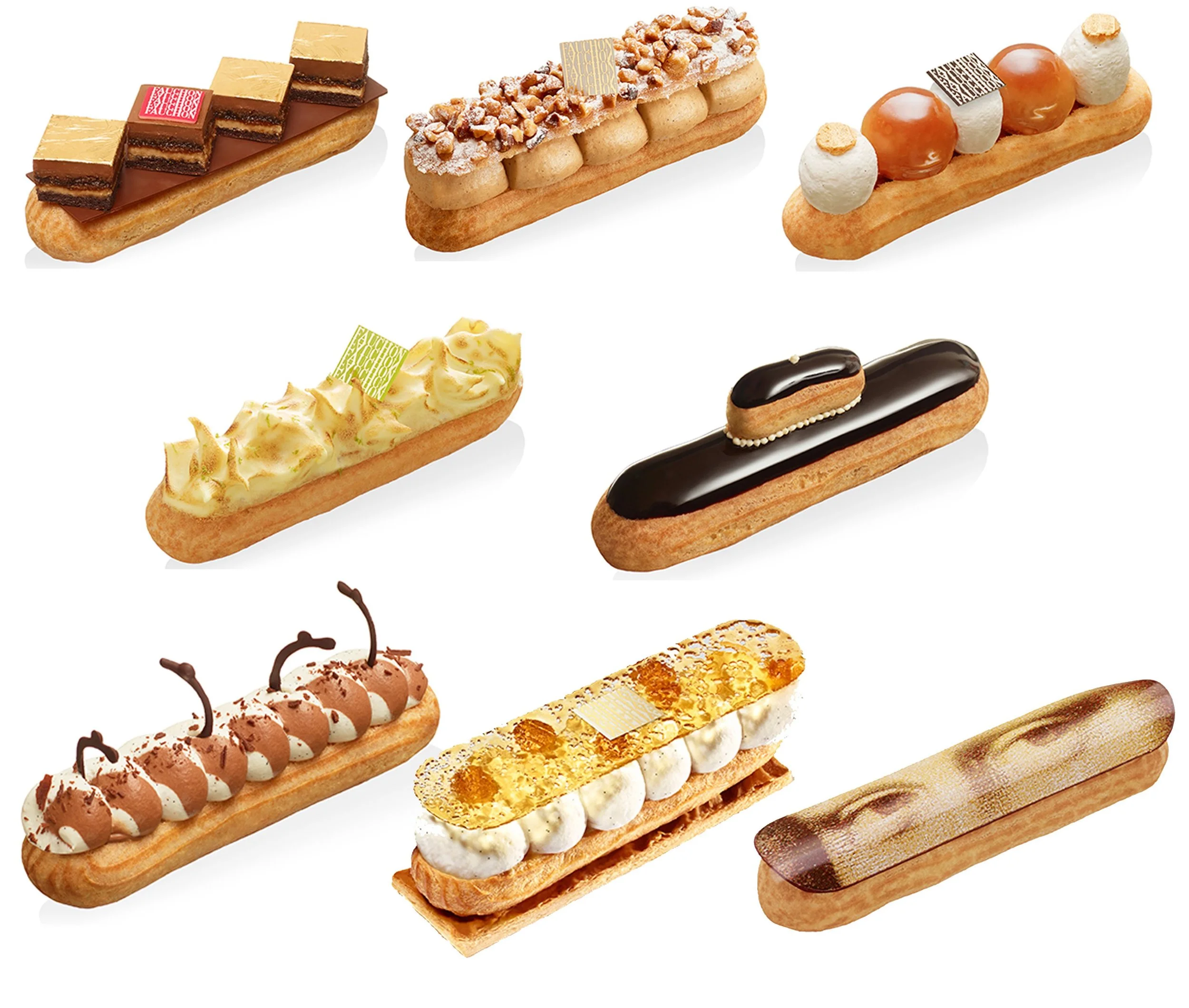 圖5. 2015 年的 Fauchon 閃電泡芙週,其中八款商品使用泡芙重現經典法式甜點如 réligieuse(修女泡芙)、St. Honoré(聖多諾黑泡芙)、Baba au Rhum(蘭姆巴巴)、tarte au citron méringuée(蛋白霜檸檬塔)、Opéra(歌劇院蛋糕)等。右下角便是 Adam 在 Fauchon 時期的代表作之一「éclair Joconde」蒙娜麗莎閃電泡芙。(圖片來源:Mon Pâtissier部落格)