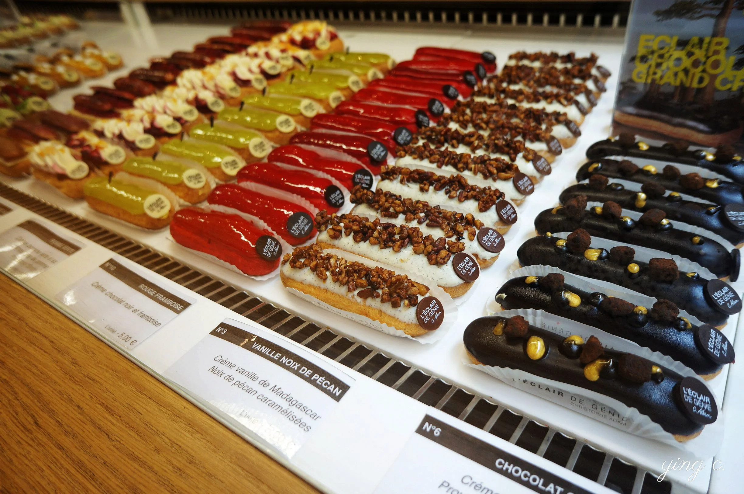 Adam 將法式甜點的製作哲學傾注在閃電泡芙上,從各個面向大幅擴充了閃電泡芙的表現空間。不僅口味變化多端、每一季都會因應當季的水果或特殊活動製作不同口味外,即使是基本的巧克力口味,也會如同專業巧克力店製作夾心巧克力般,有著各式各樣風味的奶餡。L'Éclair de Génie 並改變傳統僅使用風凍糖霜的單調裝飾方法,以裝飾蛋糕的方式來裝飾閃電泡芙,採用各式鏡面淋醬做裝飾的基底、上面再擺上與泡芙口味相應的新鮮水果或巧克力、堅果等。只要踏進店裡,沒有人不會被色彩繽紛、閃著光澤一字排開的產品吸引。瑪黑區的本店幾乎永遠都是門庭若市。