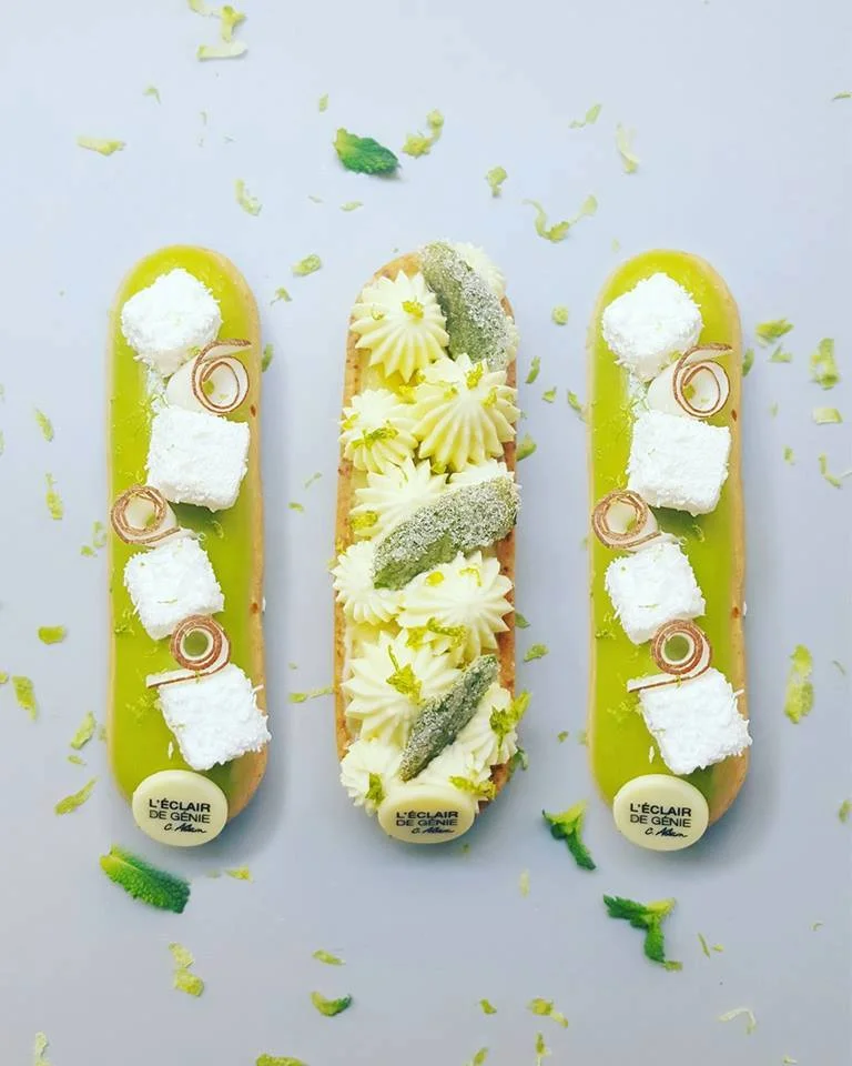 圖7. L’Éclair de Génie 今年六月剛剛推出的新品,左右兩邊是檸檬、椰子口味的新閃電泡芙,中間那個則是做成閃電泡芙長條形的檸檬薄荷塔,顯然 Adam 已經將「snacking chic」的概念延伸至閃電泡芙以外的甜點類型。(圖片來源:Christophe Adam 的 Facebook頁面)