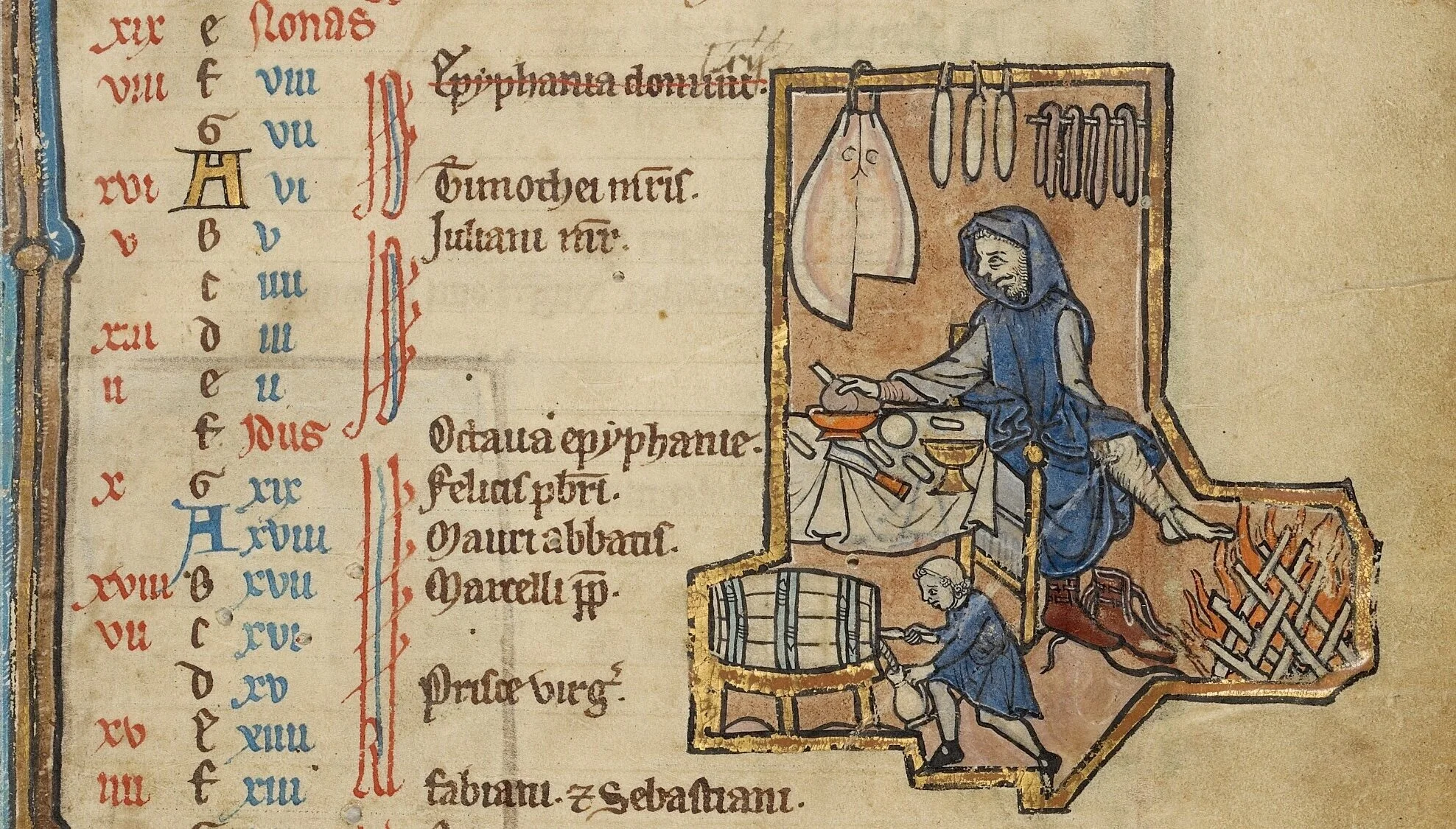 14世紀一本法蘭德斯地區根特(Ghent)的一本祈禱書中,11月月曆插畫描繪當時人們準備製作香腸的景象。(圖片來源: © Bodleian Libraries, University of Oxford)