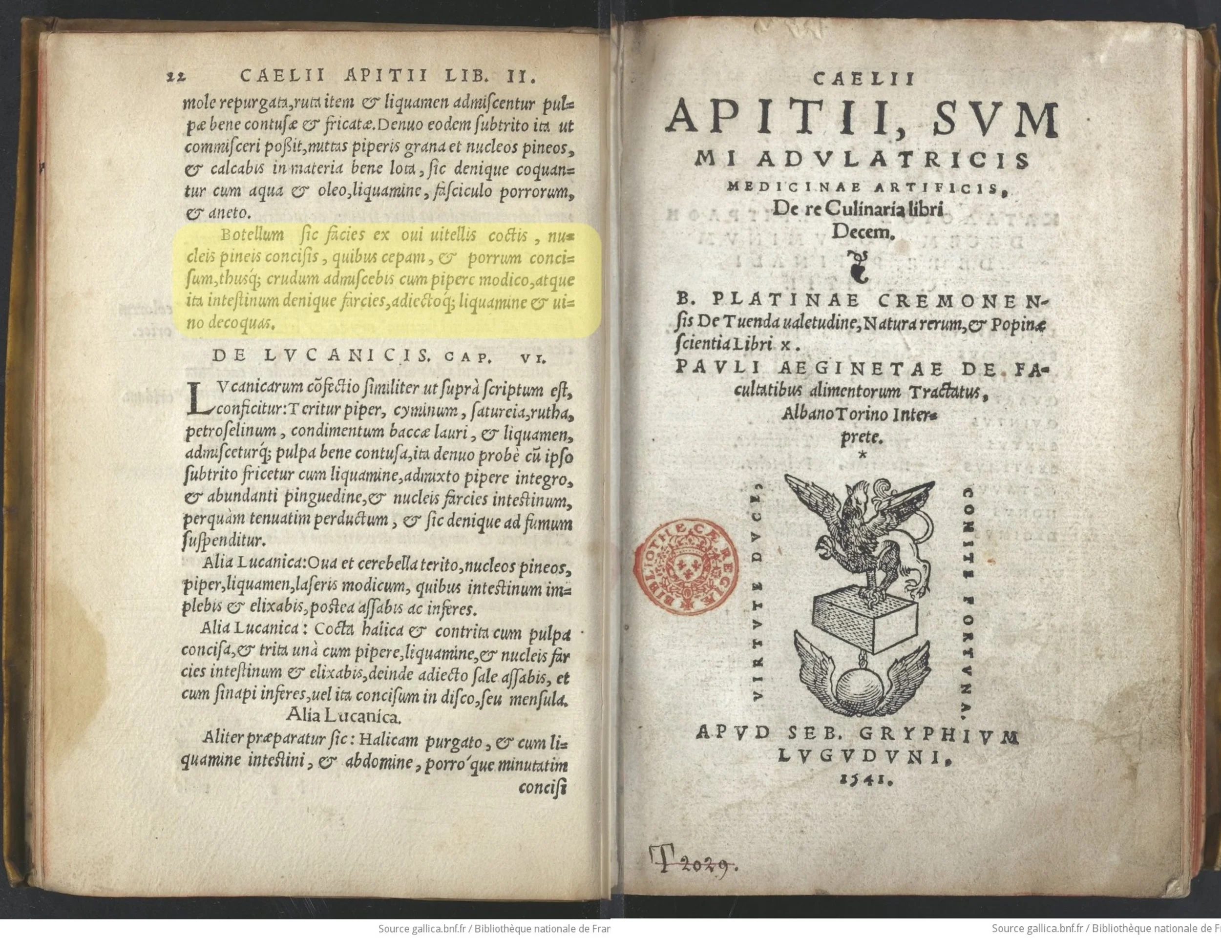《論烹飪》的16世紀拉丁語版本。圖中黃色標記處即為「小香腸」(Botellum sic facies)的食譜。(圖片來源:Gallica | BnF)
