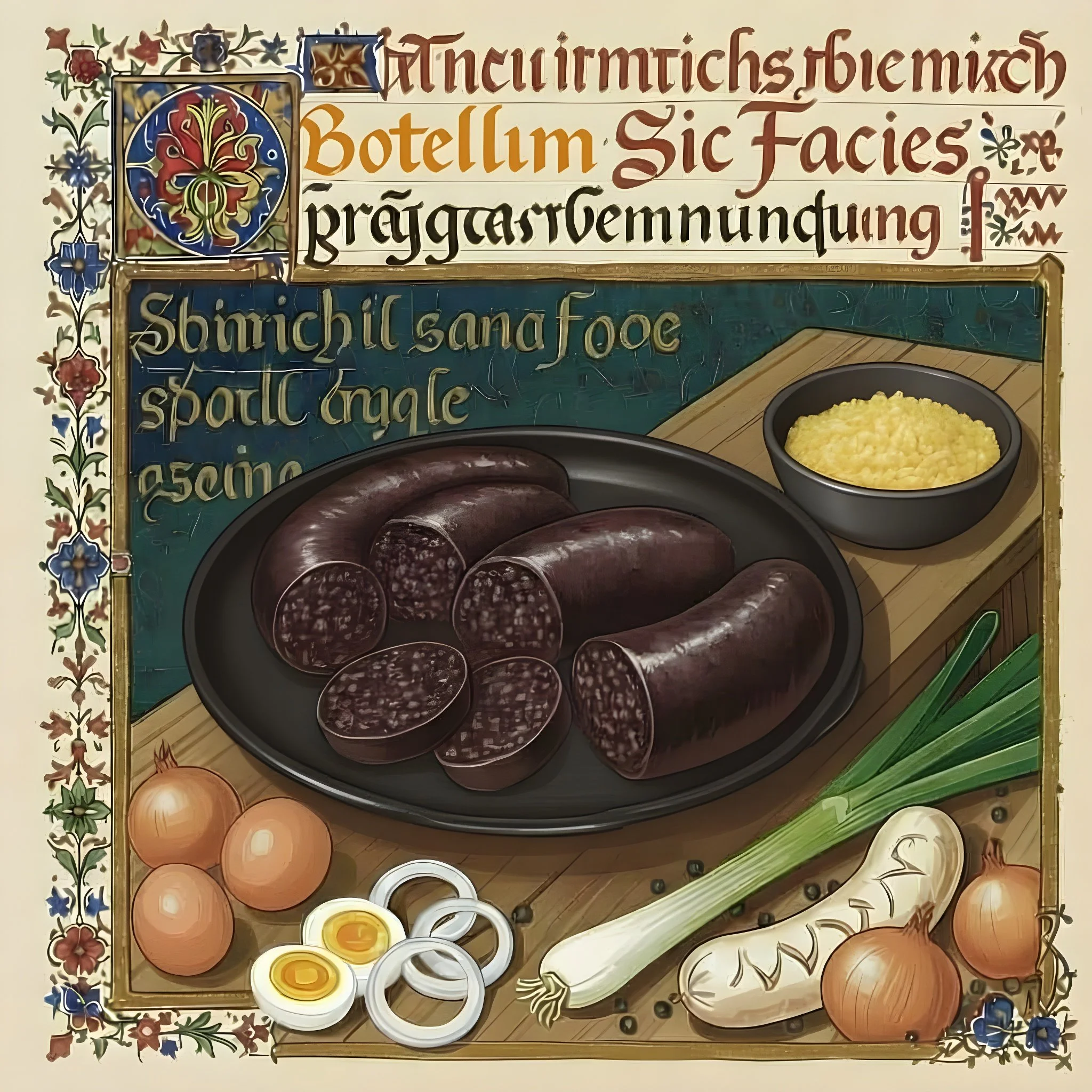 西元5世紀時的羅馬食譜集《論烹飪》(Apicius: De re coquinaria)中,收錄了許多當時的香腸做法。其中「小香腸」(Botellum sic facies)被認為可能是最早的黑布丁食譜:「將6個煮熟的蛋黃、切碎的松子、洋蔥、切碎的韭蔥、生血(thus/ius)、胡椒粉混合,填入腸衣中。以肉湯和葡萄酒煮熟。」其中「thus」這個字多有歧義,有學者認為是鮮血,也有人認為是肉湯,甚至可能是松針或是香灰(作為香料使用)。除了這道香腸以外,還有煙燻香腸(下方圖中的「Lucanicae」)及各種調味肉餡香腸、魚肉香腸等食譜。
