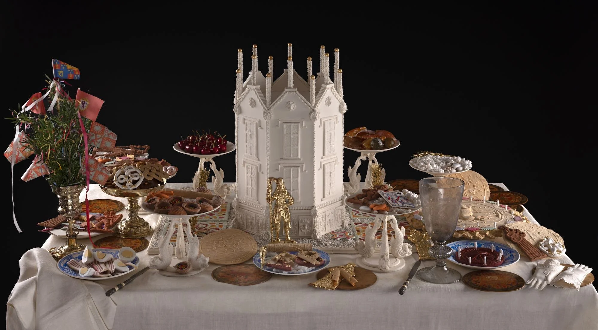 16世紀時,用糖混合樹脂製作成各種巧奪天工的「糖雕」(subtlety)在英國上層階級的宴會中大為盛行,成為財富與權勢的象徵。照片中是英國歷史學家Ivan Day為劍橋大學菲茨威廉博物館(Fitzwilliam Museum)的「盛宴與齋戒」(Feast and Fast)展覽構思並復刻的英國17世紀糖宴。中央是雪白的糖雕,桌上的杯盤則是用糖混合黃耆膠(tragacanth)製作而成的。這種精細的做法來自伊斯蘭傳統,經義大利人傳播至歐洲,風靡一時(圖片來源: Fitzwilliam Museum)
