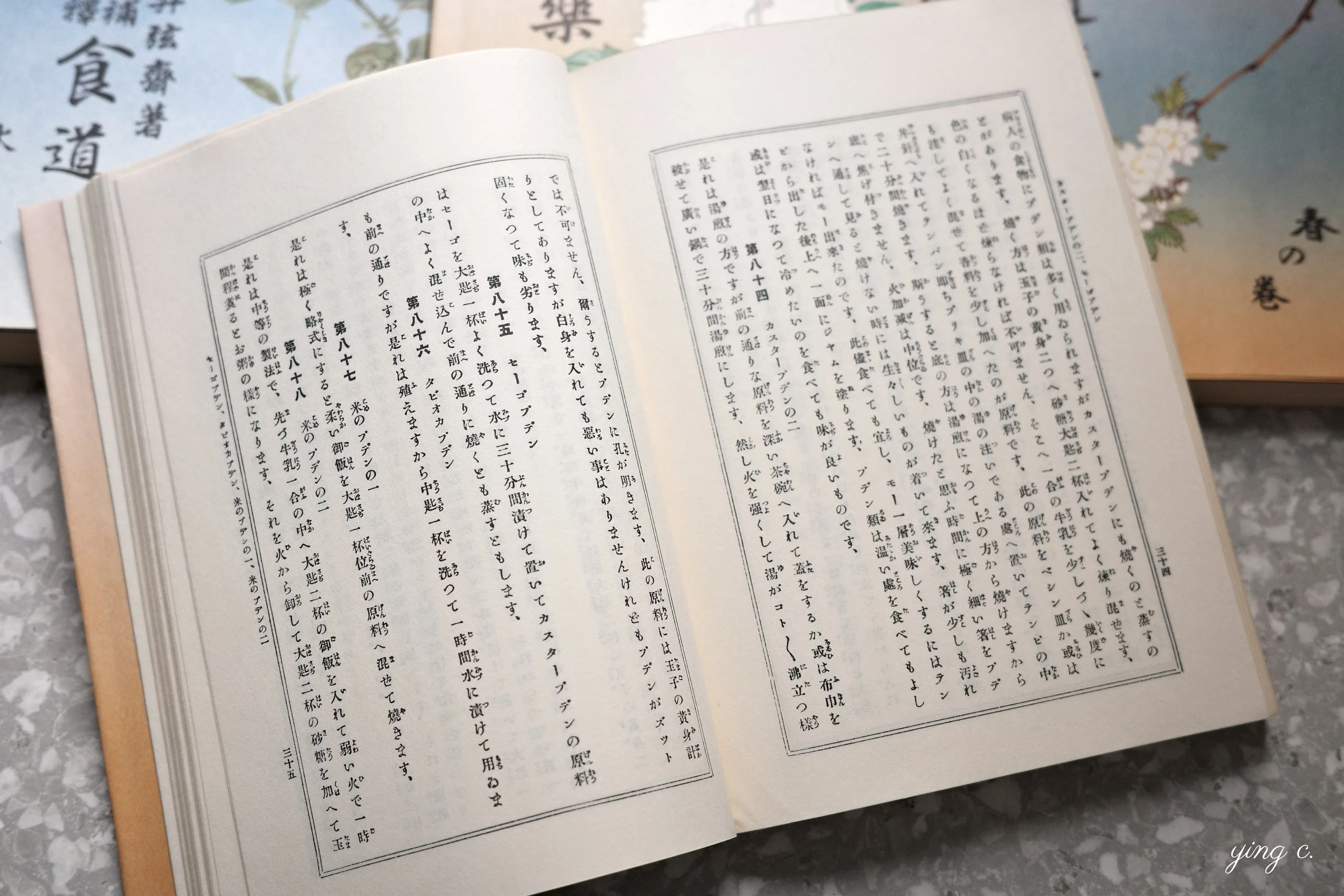 主婦熟練地混合了蛋黃、糖和牛奶。此時,她提起家裡另一本較舊的藏書《西洋料理通》,說:「以前做的『密柑ポッディング』那種蒸布丁,需要牛酪和饂飩粉,耗時又費力,吃起來紮實又厚重,也不好消化。」她搖頭笑著,顯然對那類蒸煮麵糰布丁提不起興趣。
