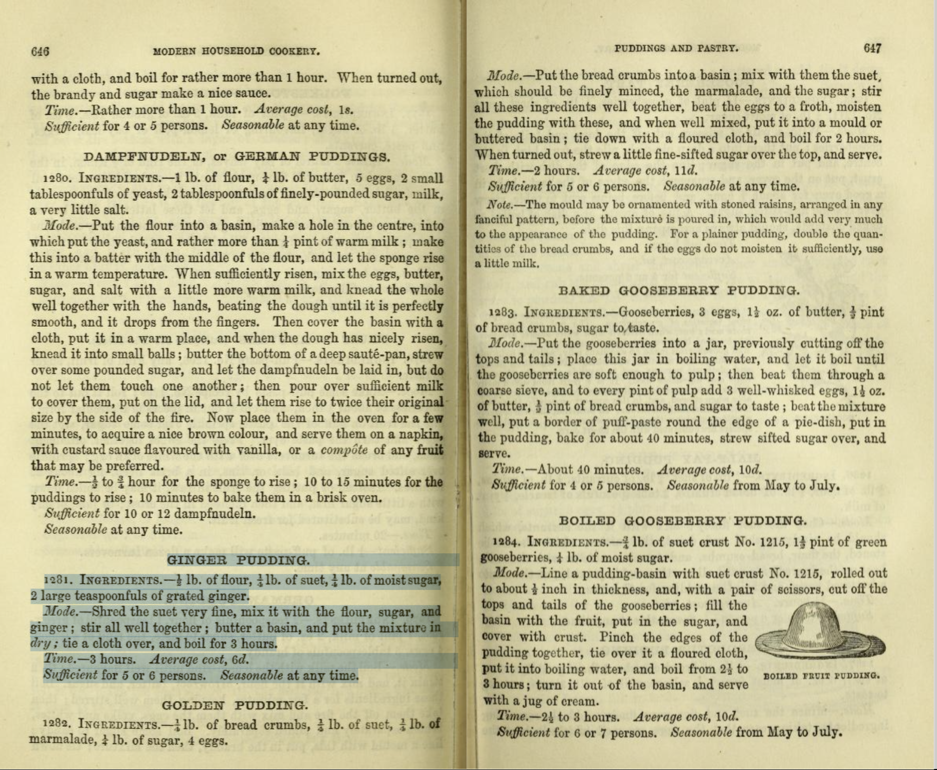 《Mrs. Beeton's Book of Household Management》中的薑汁布丁食譜,與《西洋料理通》中的「生姜ポッディング 」食譜相同。(圖片來源:Internet Archive)