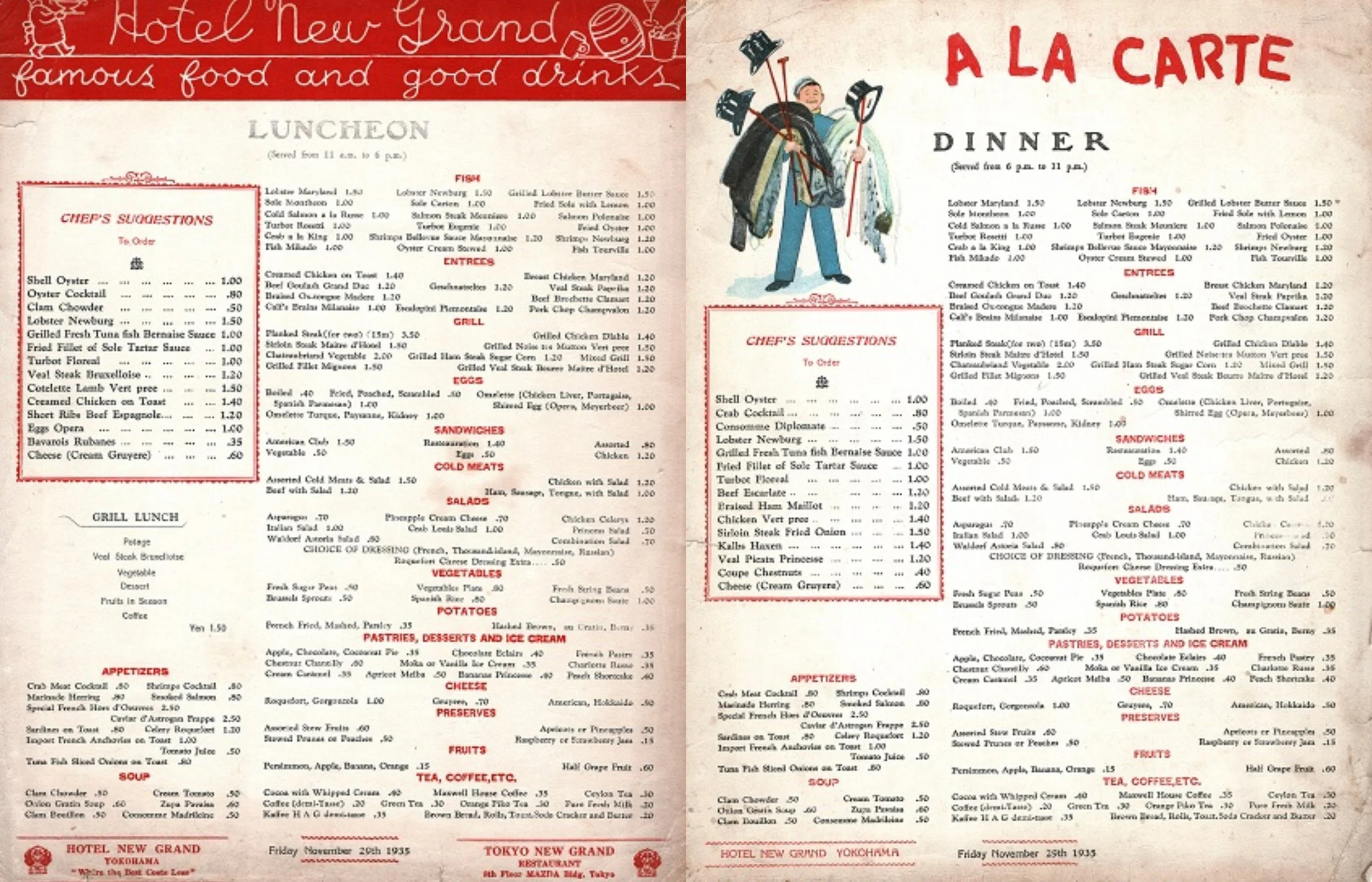 Hotel New Grand 1935年的餐廳午餐(左)與晚餐(右)菜單,在「Pastries, Desserts and Ice Cream」區中都有「Cream Caramel」。(圖片來源:風船舍)